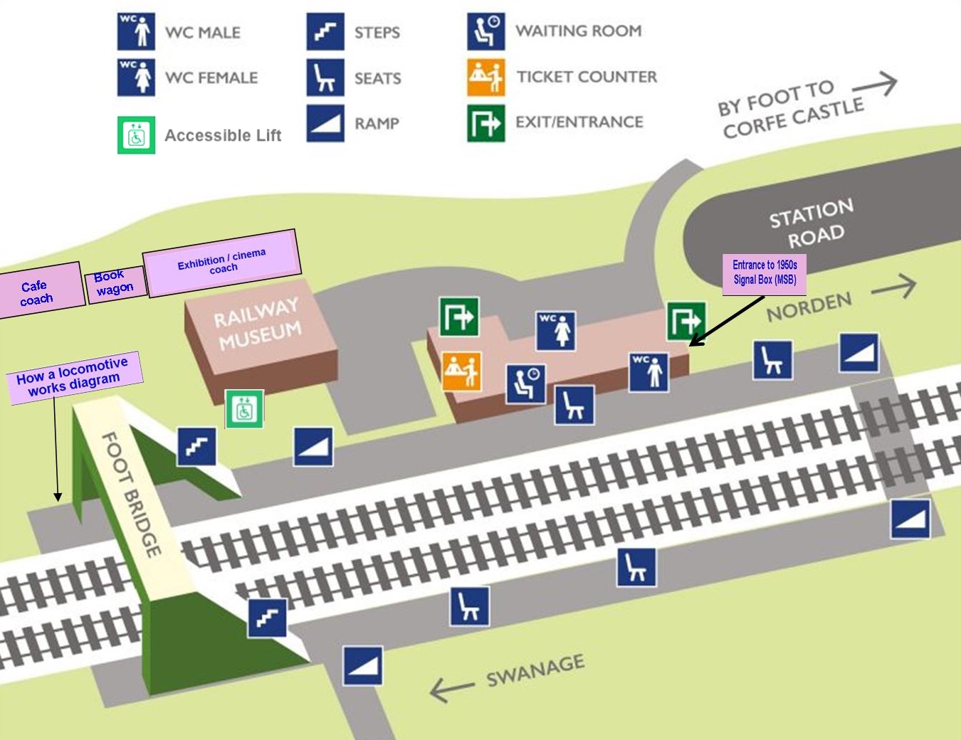 The Museum is located behind the Station at Corfe Castle.Please note there is no parking at the Museum or Corfe Castle station, but there are toilets. No food and drink are permitted in the museum, but there are two picnic areas within the station grounds.